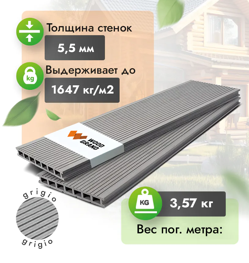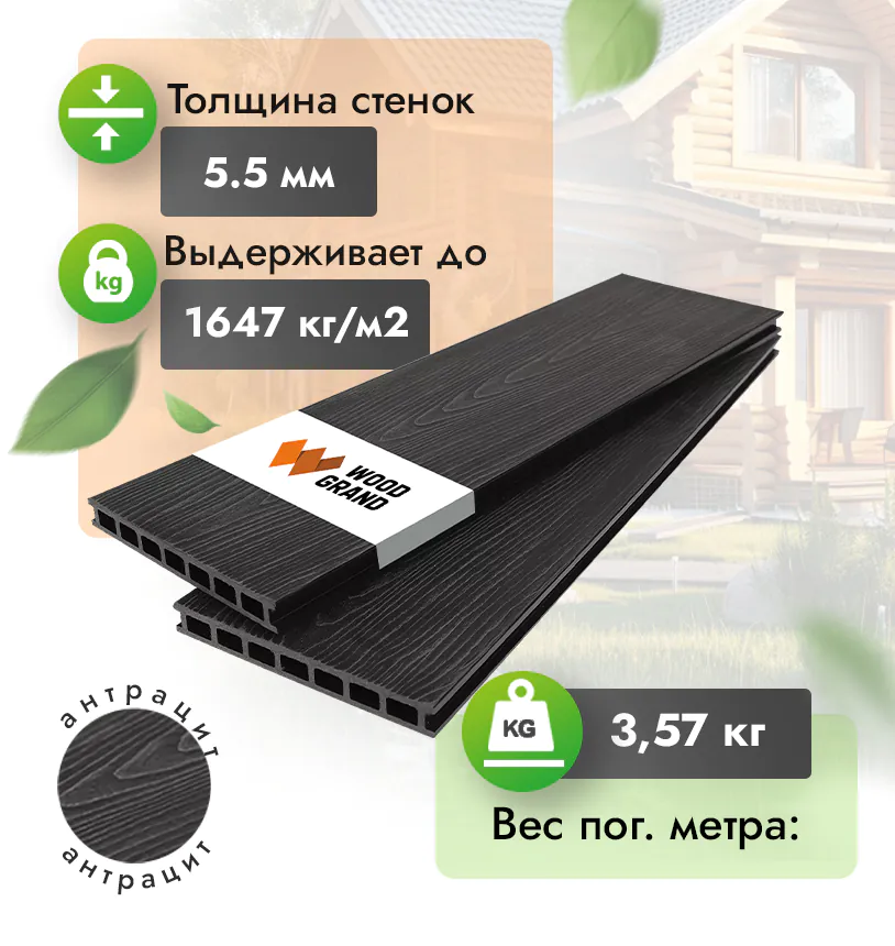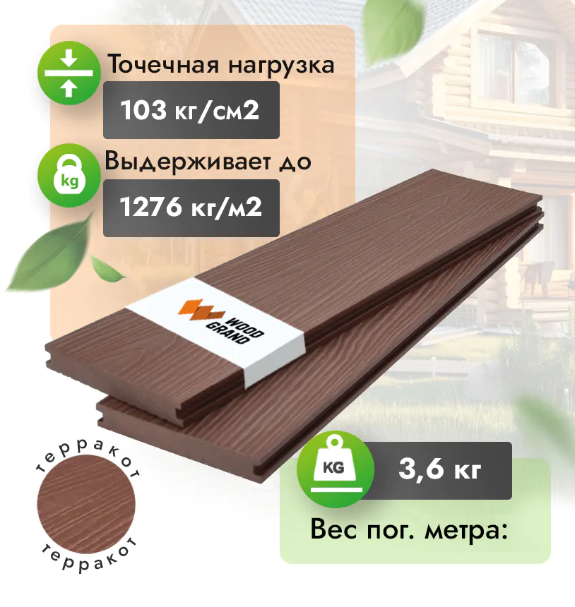 Наша террасная доска из ДПК выдерживает до 3318 кг/м2, влагостойкая, не требует ухода.
